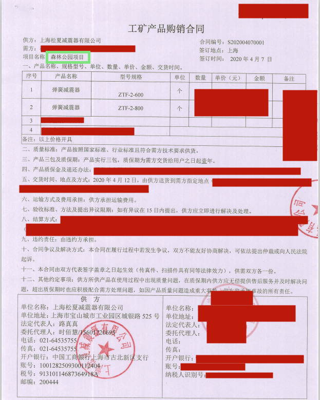 上海松夏減震器有限公司官方網(wǎng)站為您介紹:【福州森林公園項目】使用ZTF型彈簧減震器采購合同信息,我們松夏公司2020年為【福州森林公園項目】使用ZTF型彈簧減震器,起到了減震和降噪的作用,以下是【福州森林公園項目】使用ZTF型彈簧減震器采購合同介紹。
